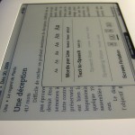Le rendu de l’écran est-il au rendez vous ? A première vu oui, pour ma part, pour le peu que j’ai pu lire j’ai trouvé ça très agréable et reposant (haha, ça c’est la mauvaise idée de lire avant de me coucher, en général quand je m’allonge je reste pas longtemps éveillé), on retrouve la même contrainte qu’un livre aussi – une source de lumière est indispensable car l’écran n’est pas retroéclairé pour éviter toute fatigue des yeux, mais on a droit à quelques avantages comme choisir la taille de la police, 6 tailles différentes de police s’offre à vous, mais aussi le nombre de mot par ligne et enfin le type d’affichage (portrait par défaut, et payasage).